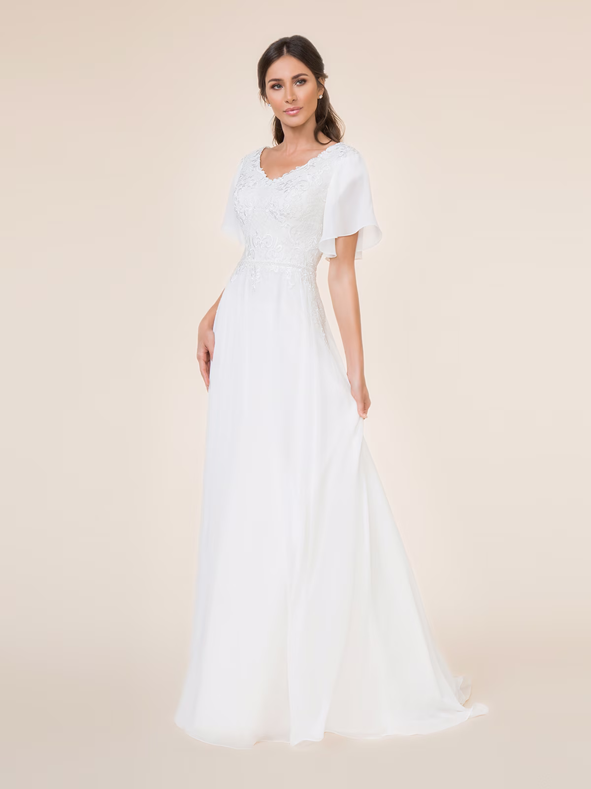 Flowing crepe gown with flutter sleeves