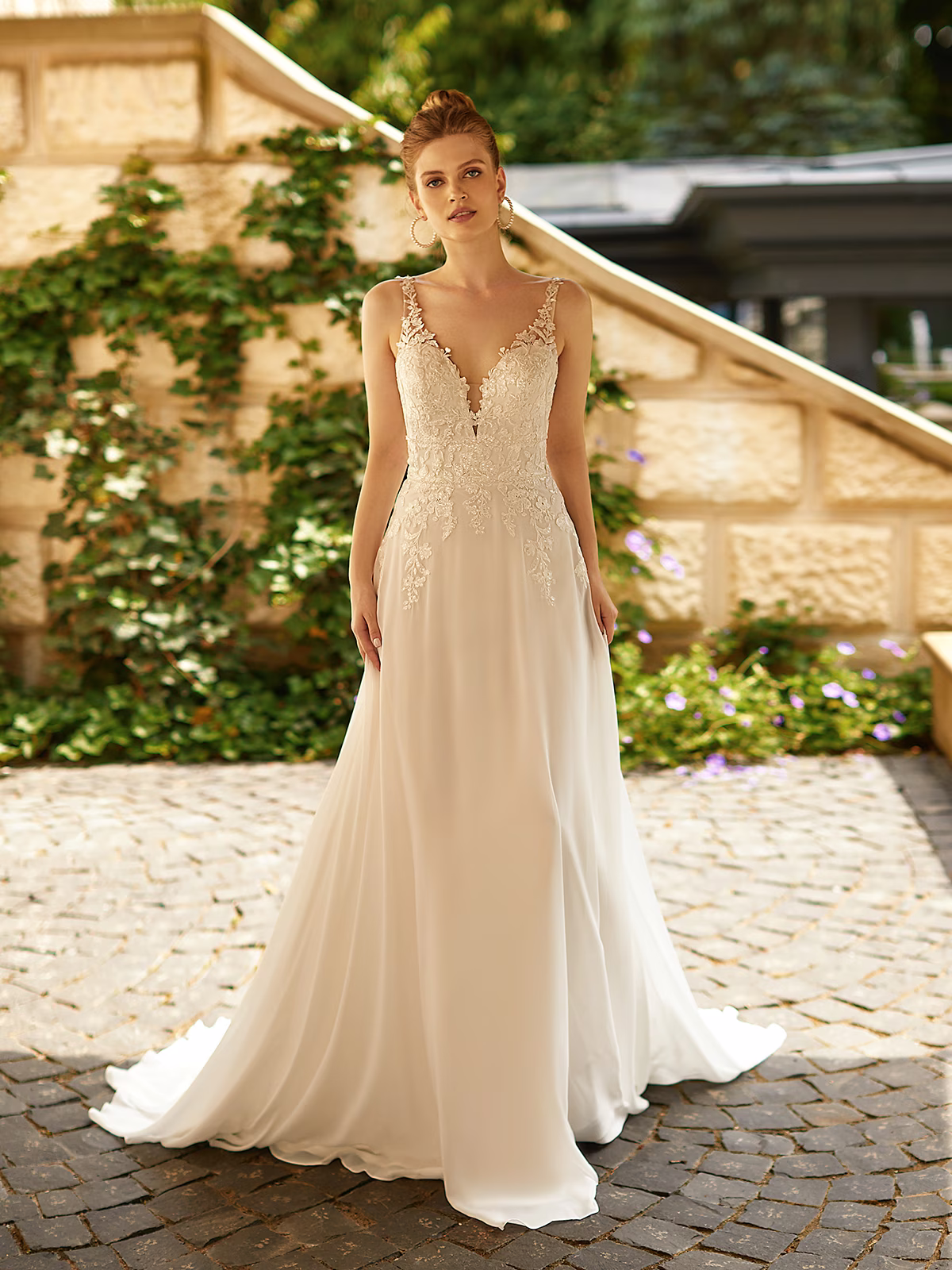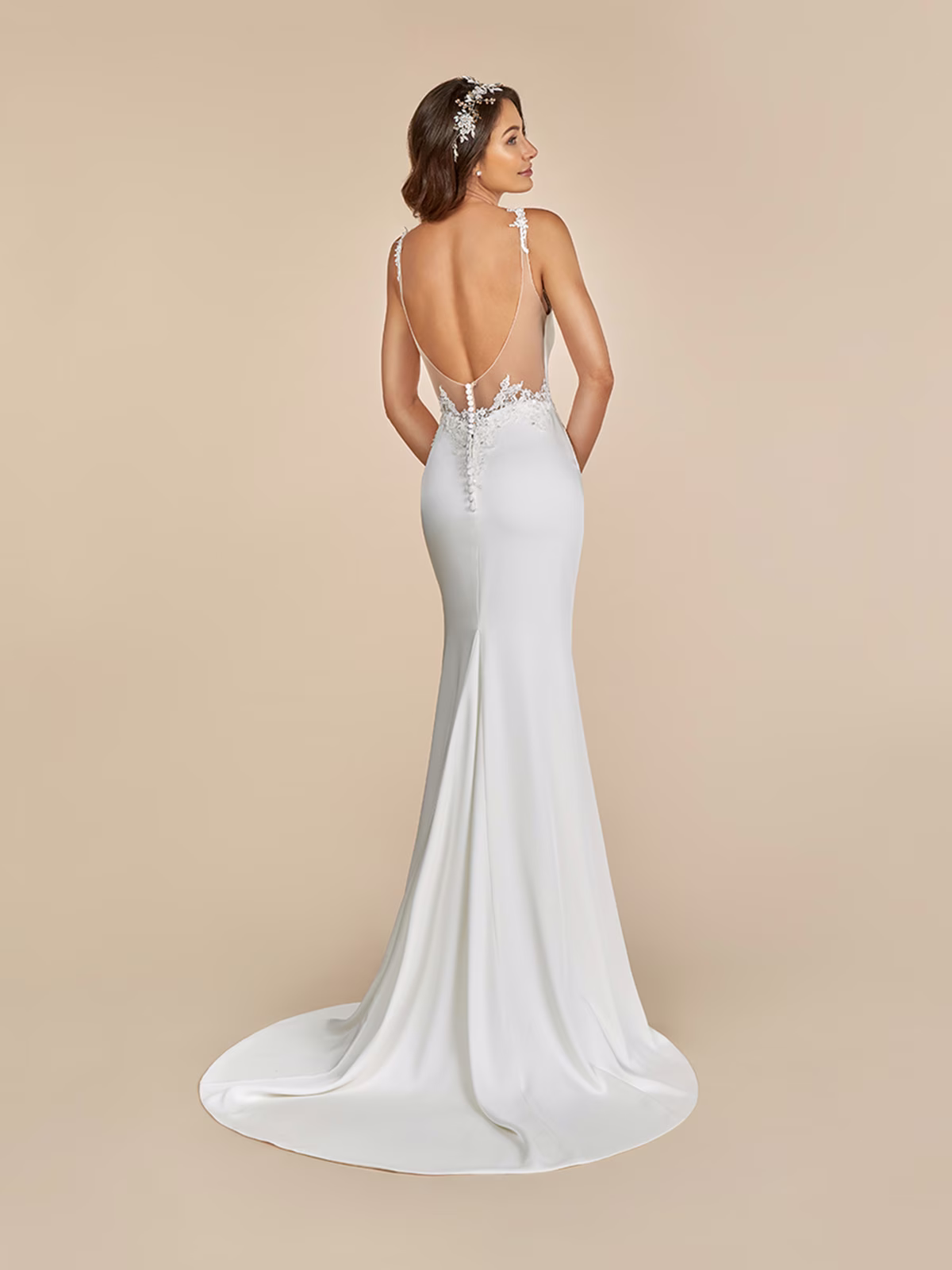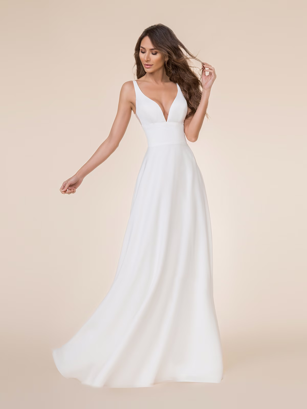 A-line bridal gown with a deep V-neckline and illusion back