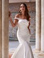 The Moonlight Collection J6898 wedding dress boasts a sculptural quality that exudes elegance, but it’s the smooth Mikado fabric that lends ultra-glamorous style to this beautifully crafted design. The fabric and mermaid shape are the key features of this dress, as it is not embellished with beads or adorned with any appliques, crystals, or sequins. But this dress doesn’t need any of that, because it’s the understated simplicity of the silhouette that makes it such an eye-catching choice. This bridal gown is fitted through the bodice and hips and features off the shoulder cap sleeves, a slight scoop neckline, a drop waist, and ruched details that gather on one side on the front of the dress. The back of the dress is ruched towards the center back, creating a sense of symmetry that contrasts artfully against the asymmetrical front. The mermaid skirt flares out from about the knees down in bold pleats with a sweep train, and the back is finished with a row of tiny covered buttons that run the entire length of the center back all the way to the edge of the train. The Moonlight Collection J6898 wedding dress is available in classic shades of white and ivory as well as solid black for the bold bride who’s ready to make an unconventional fashion statement.