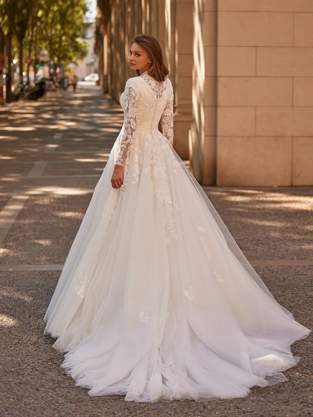 Adorn yourself this romantic ethereal bridal gown as you start your classic love story in Moonlight Modest M5086. Feel like a princess in this beloved A-line silhouette that is decorated in vintage-inspired floral beaded lace appliques that blooms across the fitted bodice to the natural waistline that softly flows into the voluminous A-line skirt with layers of delicate tulle. Effortlessly accentuating the silhouette is the beaded waistband that creates a mesmerizing effect as it shimmers under the soft sunlight casting a romantic glow upon your gown. As sweet as your love, the sweetheart neckline frames your radiant smile while highlighting your decolletage, adding a touch of allure with a modest demure. Providing subtle coverage for the modest brides are dreamy long illusion bishop sleeves with buttons along the cuffs that add a touch of whimsical charm. Draw attention as you take a spin to reveal the alluring wide V-back neckline detailed with timeless romantic buttons with loops that trail along the zipper. As you make your way down the aisle, the sweep train elegantly trails behind your every step leaves a trail of sheer beauty that will leave your guests in awe. Radiate an undeniable glow in a beautiful shade of Ivory.