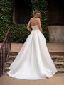 Our Moonlight Tango T171 wedding dress is pure magic in a ball gown silhouette crafted in lustrous satin fabric. This voluminous bridal gown features a fitted bodice with a strapless pointed sweetheart neckline, a small illusion inset at the center of the bust, and beautiful diagonal pleating and ruching that adds a touch of texture. In back, the bodice secures with a center back zipper concealed by a lovely row of covered buttons and features a natural waist seam that gives way to a full ball gown skirt. If it’s grandeur you want, this gorgeous gown delivers with structured box pleats at the back of the skirt and side pockets that make it easy to strike fabulous wedding day poses for your photo album. The skirt is detailed with a sweep train with thin horsehair trim at the hem and a clean finish that gives it a crisp, modern look. From your walk down the aisle to your last dance at the reception, this is the dream dress for the bride who wants to feel like modern-day royalty on her wedding day. The Moonlight Tango T171 bridal gown is available in a stunning shade of ivory to complement any and every bride.